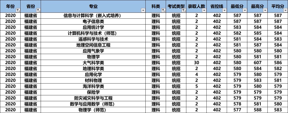 2、南京信息工程大学福建省2020年理科专业录取数据: