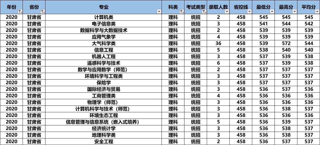 3、南京信息工程大学甘肃省2020年理科专业录取数据: