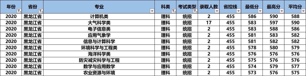 9、南京信息工程大学黑龙江2020年理科专业录取数据: